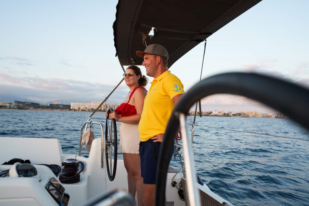 Drei Personen genießen einen sonnigen Tag auf einer Segelyacht. Ein Mann steuert, während eine Frau und ein anderer Mann zuschauen. Alle tragen Schwimmwesten und Sonnenbrillen.
