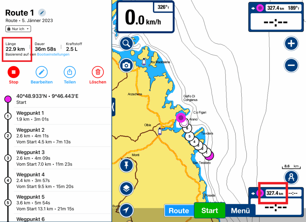 Tippe lange auf Start‑ und Endpunkt, wähle Route hinzufügen und verschiebe Wegpunkte per Drag‑&‑Drop. Praktisch für Törns in Flachwassergebieten.