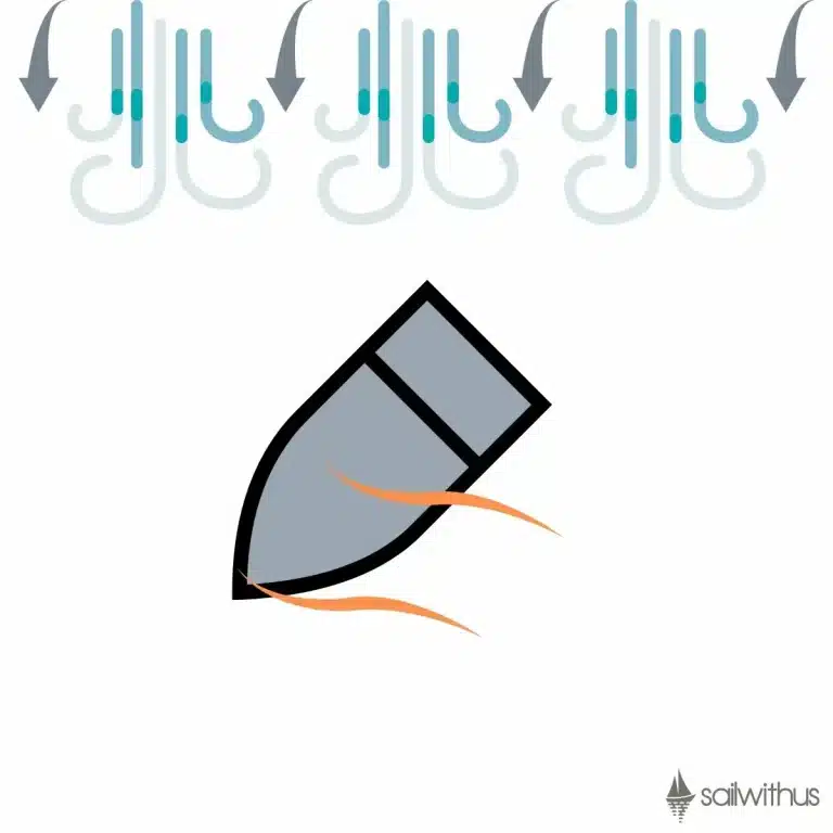 Auch eine Schräglage (Krängung) ist beim Vorwindkurs sinnvoll, um das Segel möglichst so stehen zu haben, dass es den meisten Wind einfängt. Das Schwert kann ebenfalls angehoben werden.